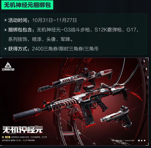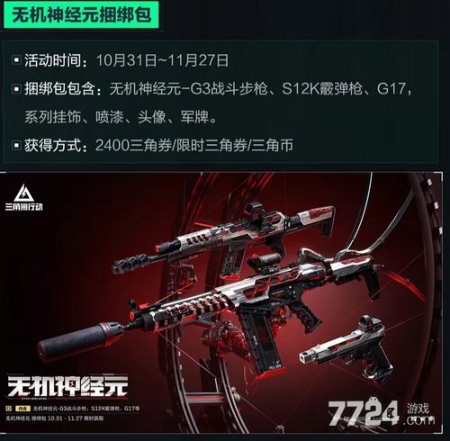 捆绑包内容:G3战斗步枪、S12K霰弹枪、G17几把枪械皮肤以及其他喷漆等内容,售价2400三角券。